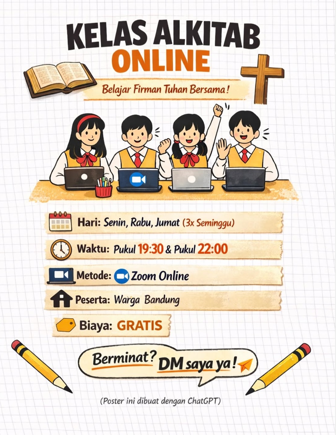 Saya ingin mengundang kakak untuk bergabung dalam Kelas Persekutuan Alkitab Online melalui Zoom yang diadakan secara Gratis.